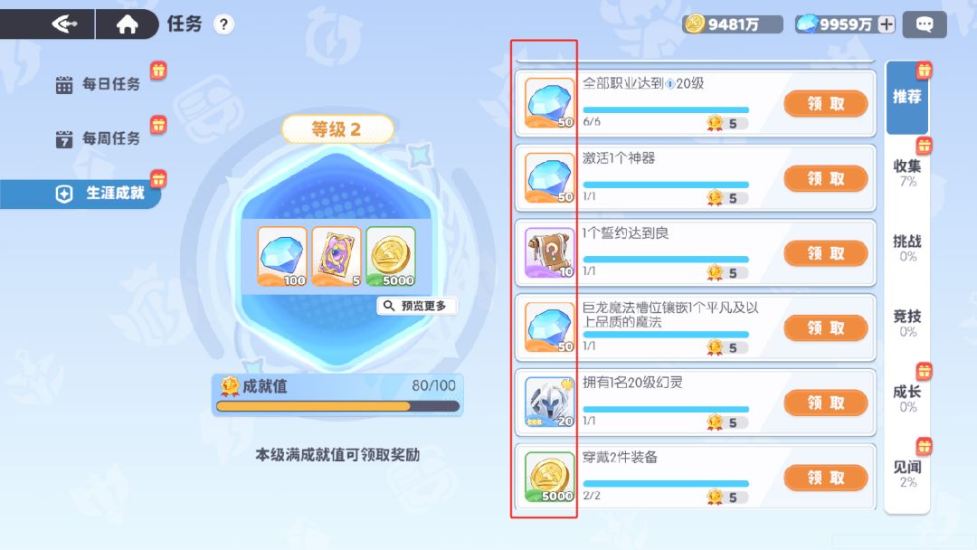 活动获取的资源奖励除了表格中提到的资源,前期跟随游戏中的各种活动同样可以领取丰厚的资源奖励:[生涯成就]完成成就任务的目标即可领取对应奖励,内容包括:钻石、幻灵经验、巨龙精魄、龙血、好感度道具、召唤券、竞技币……等等。