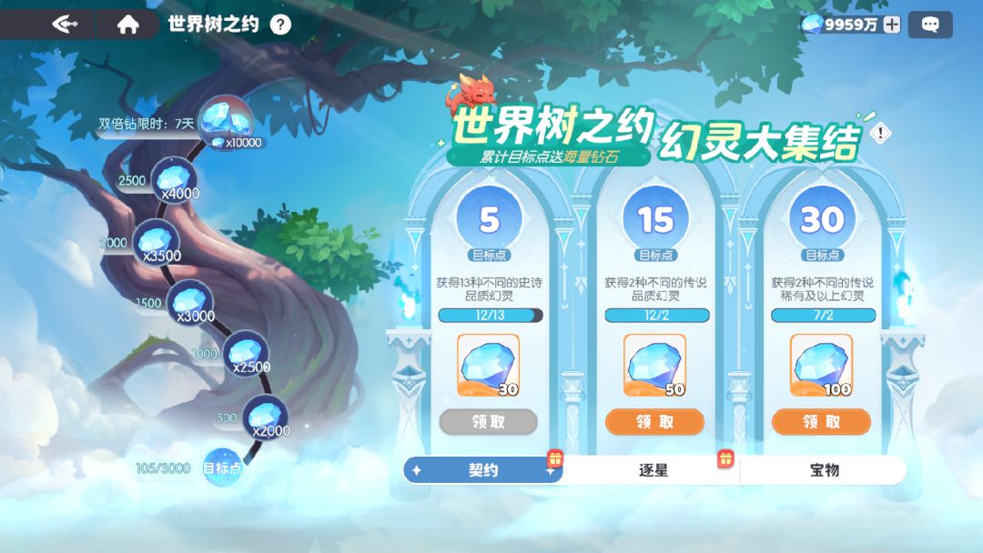 [世界树之约]根据你已获得的幻灵和宝物等级解锁相应目标。完成目标后可领取钻石奖励: