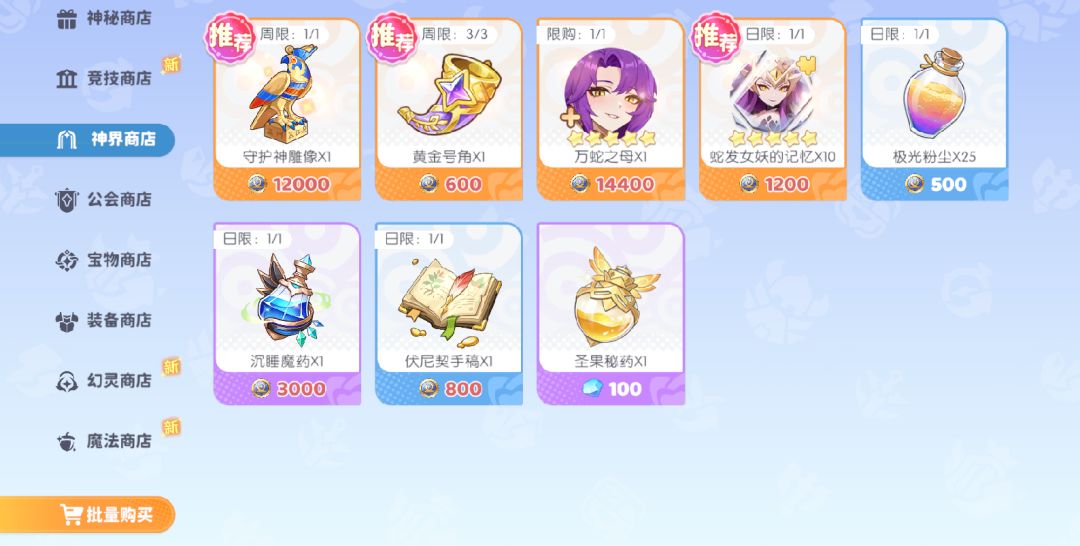 另外神界裂隙战斗胜利后获取的神界币,可以在神界商店中兑换到宝物、角色碎片等奖励,个人是会优先屯起来换宝物。