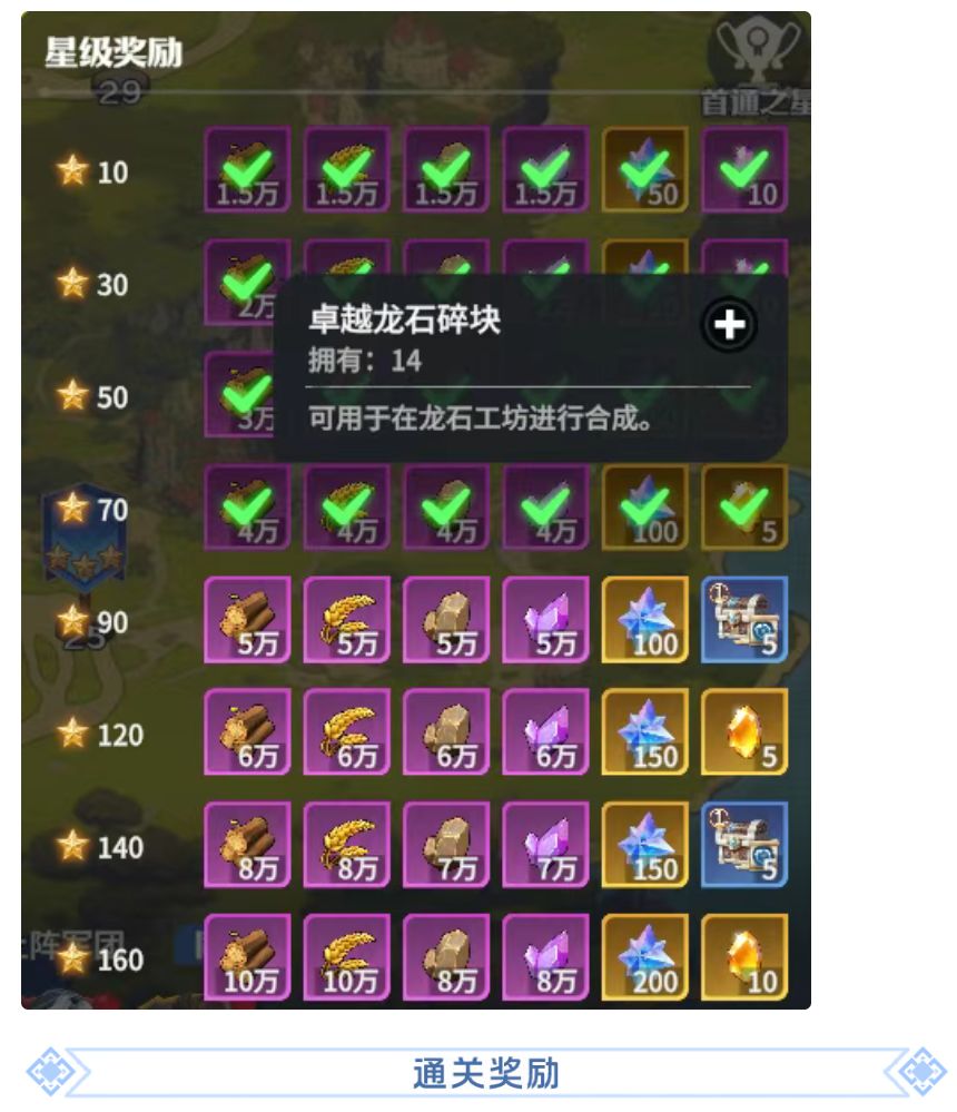 总星级奖励包含大量资源奖励,科技升级奖励,龙石合成和洗练材料奖励,建议小伙伴尽量3星完成拿满奖励。