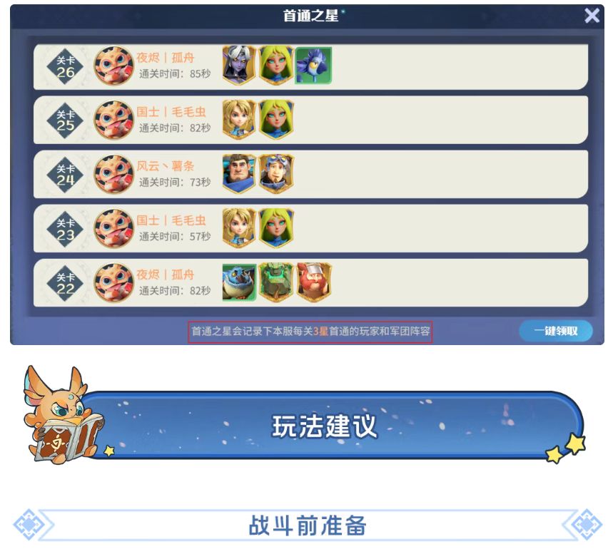 记录服务器烽火夺城玩法中,每个关卡的首通玩家及其使用阵容。