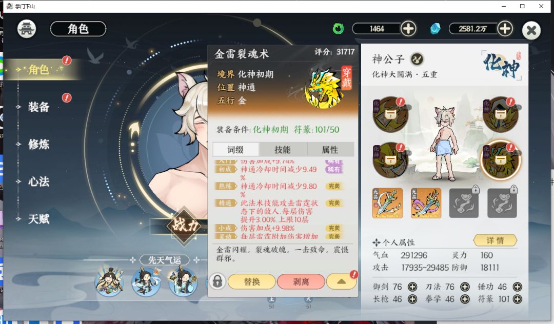 经过一点点测试,发现4个位置带全部金符+符心法,可以给怪上3个独立的雷霆buff(婉儿自己也单独一个雷霆buff)