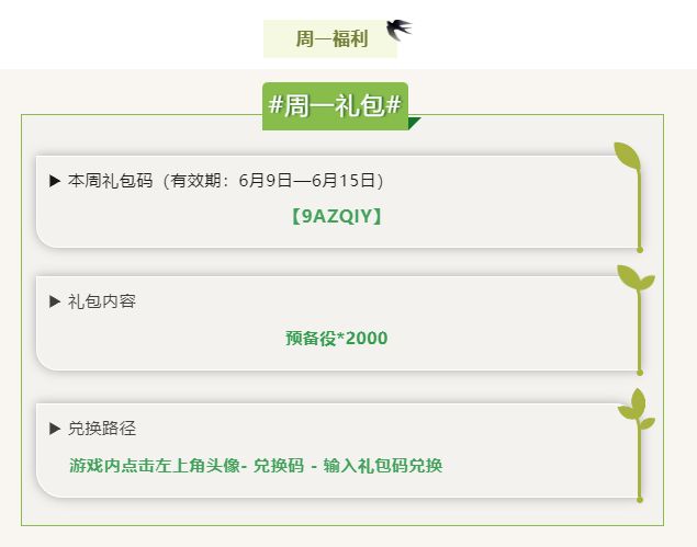 每周礼包码来了,领取时间6月9日到6月15日