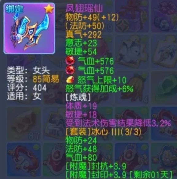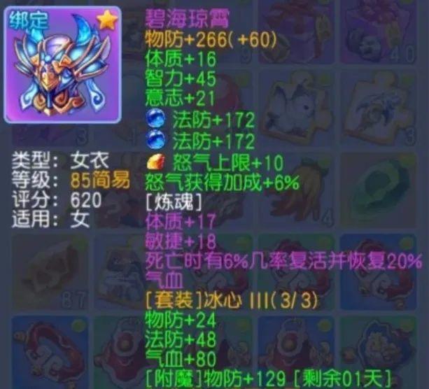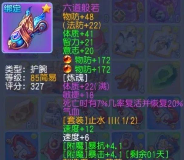 附加属性体质 + 敏捷共计77,虽在紫色简易中不算高,但搭配合理,适合辅助职业。