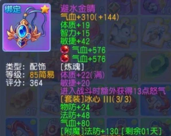 配饰基础属性气血310,已达90级简易装备全满,基础属性出色。