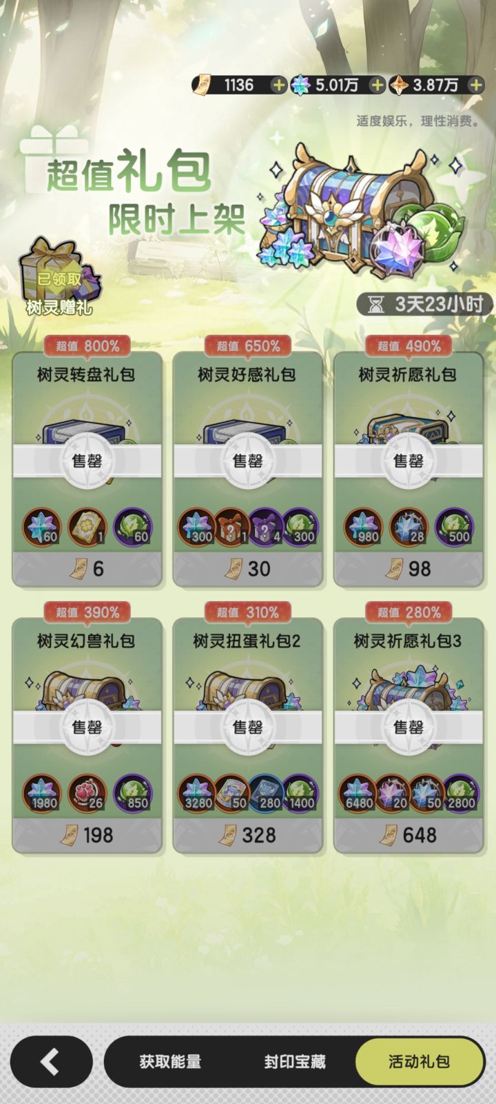 这里特别提示秘宝大作战的礼包,其实性价比比标注的性价比高得多,因为礼包里面一点能量是按2晨星算的,实际在兑换的时候可以购买1.5倍以上价值的物品(如1200能量能换40抽或者40金卡,相当1200能量于能换价值4000的物品)