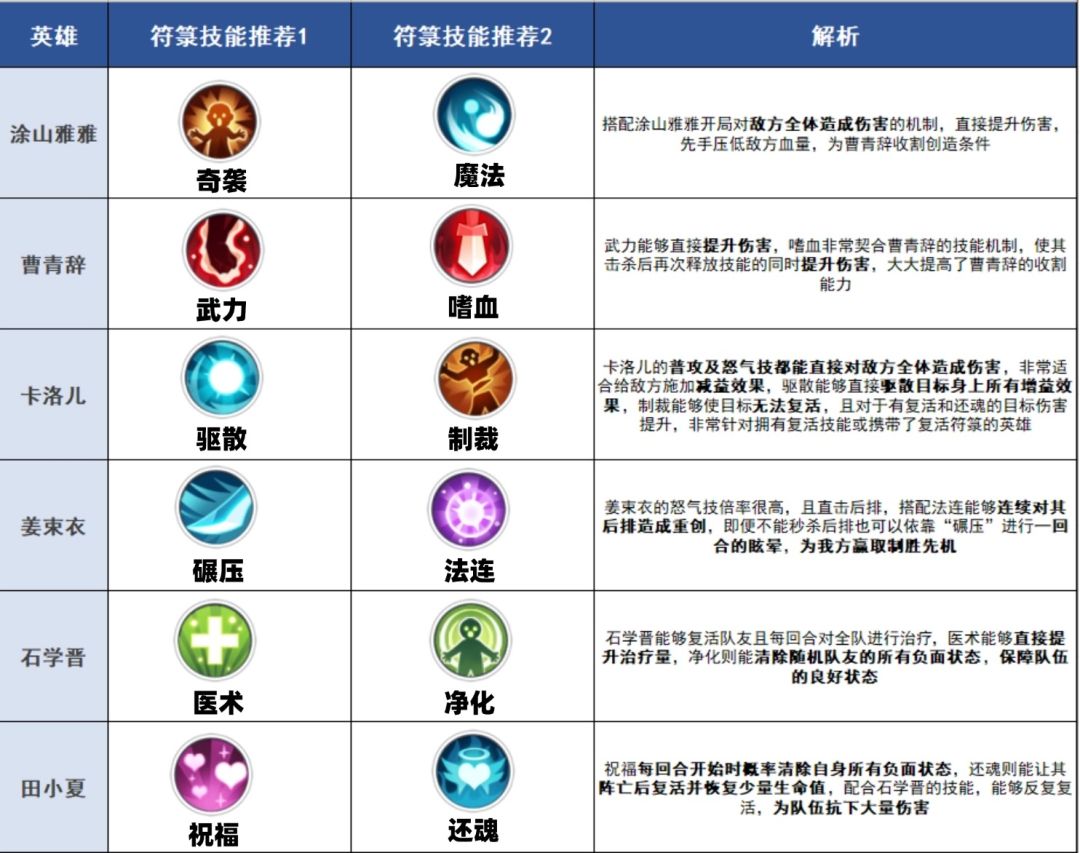 常言道进攻是最好的防守,合适的符箓优先给核心输出携带,后续有多余的符箓再给前排及辅助携带,一个完整且优秀的阵容应当搭配全面的符箓,包含进攻,防御,功能三大方面;拿以下阵容举个例子,推荐几个符箓组合
