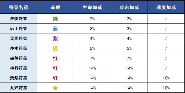 符篆会给英雄提供一定的基础属性加成,具体如下表: