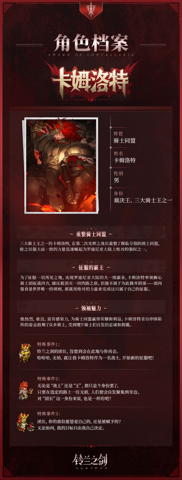 在一次次战争中,卡姆洛特亲自冲锋陷阵,碾压般消灭挡路之敌。他热烈,豪迈,富有感染力,为骑士同盟赢得荣耀和利益,受到麾下骑士们自发的忠诚和拥戴。