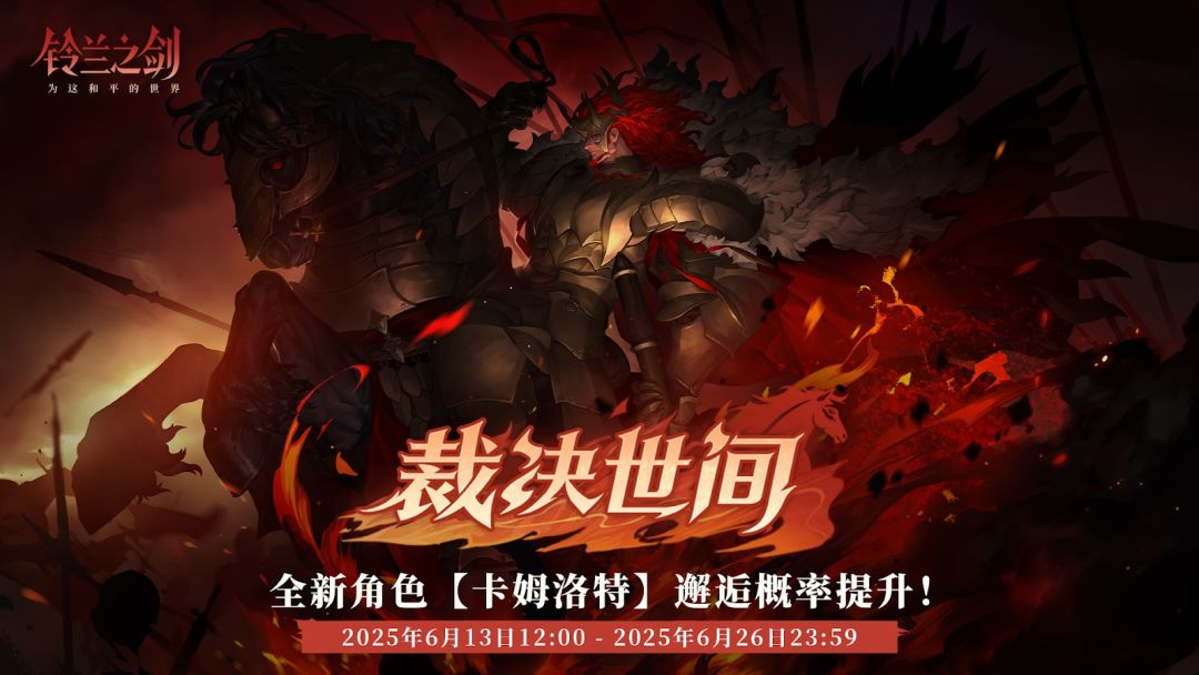 「裁决世间」初遇限时邂逅将于 2025/06/13 12:00 - 2025/06/26 23:59 开启,全新传说角色「卡姆洛特」邂逅获取概率将大幅提升!