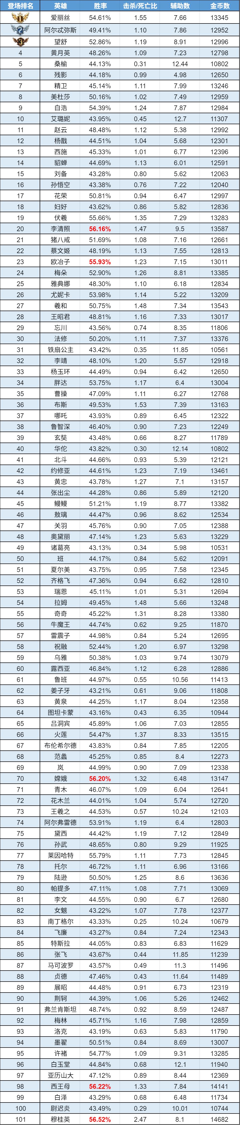 排序:按登场率高低排序,标红为胜率前5