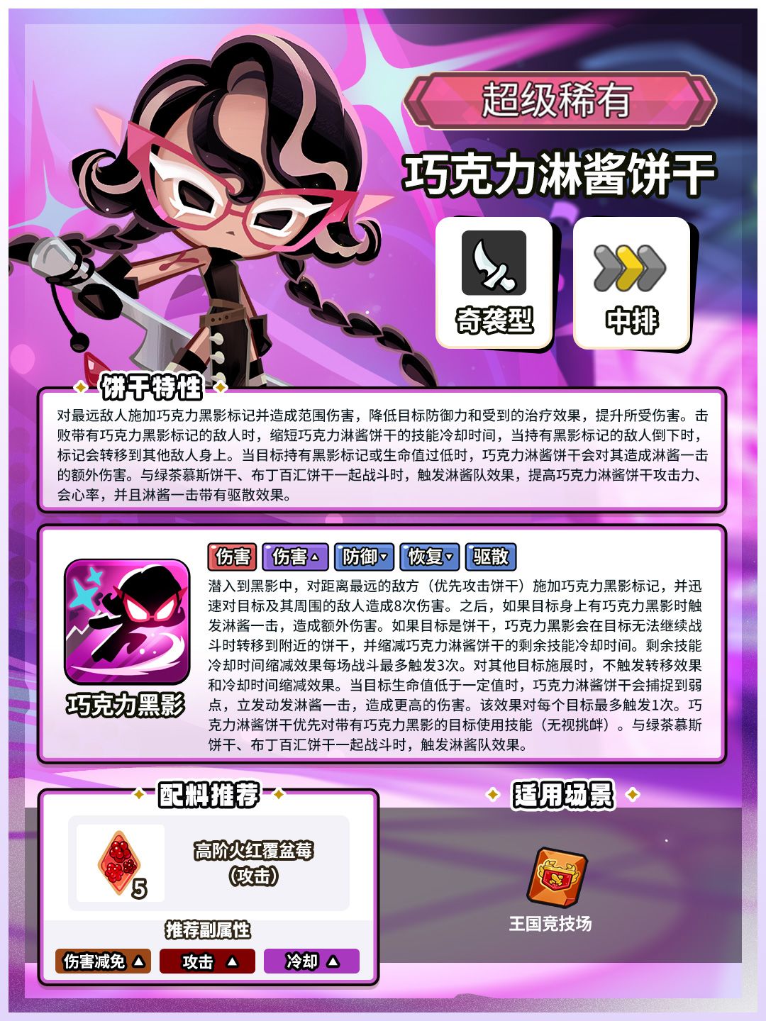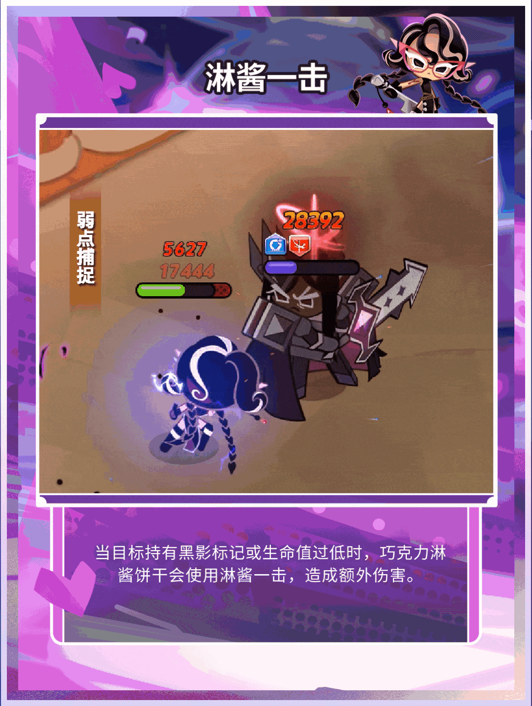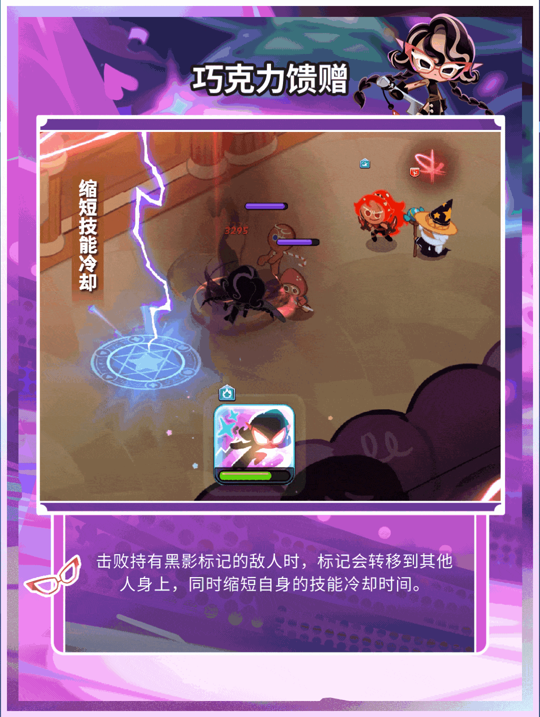 击败带有标记的敌人时,会缩短巧克力淋酱饼干的技能冷却时间,当持有标记的敌人倒下时,标记会转移到其他敌人身上。当目标持有标记或生命值过低时,巧克力淋酱饼干会对其造成额外伤害。与绿茶慕斯饼干、布丁百汇饼干一起战斗时,还能触发淋酱队效果。