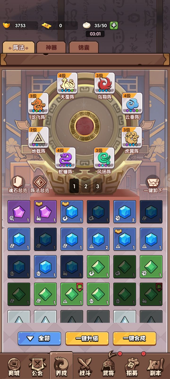 2其次,开局武将选择。首选双弓,夏侯渊略胜一筹,因为有爆炸伤害,普攻也有爆炸伤害,碎片来源快,蓝将蓝色一星基础攻击就相当于紫将黄忠绿色四星,相当于金将夏侯惇绿色一星。双弓配双乔,鲁肃加貂蝉,基本打到60关没问题。之后开始有五虎,还是建议双弓加三虎和鲁肃,貂蝉,五虎性价比有点低。这时候就要注意魂石,如果弓的 没有弹道和穿透,而枪有,那么主力就到五虎,黄忠就只能打辅助了,五虎里面最强的毫无疑问赵云,七进七出。开区7天以后,神器也出了,可以根据神器再修整队伍。前中期,三皇曹操剑系开始称王,枪刀系目前版本不够强势,最后三火谋系封神。