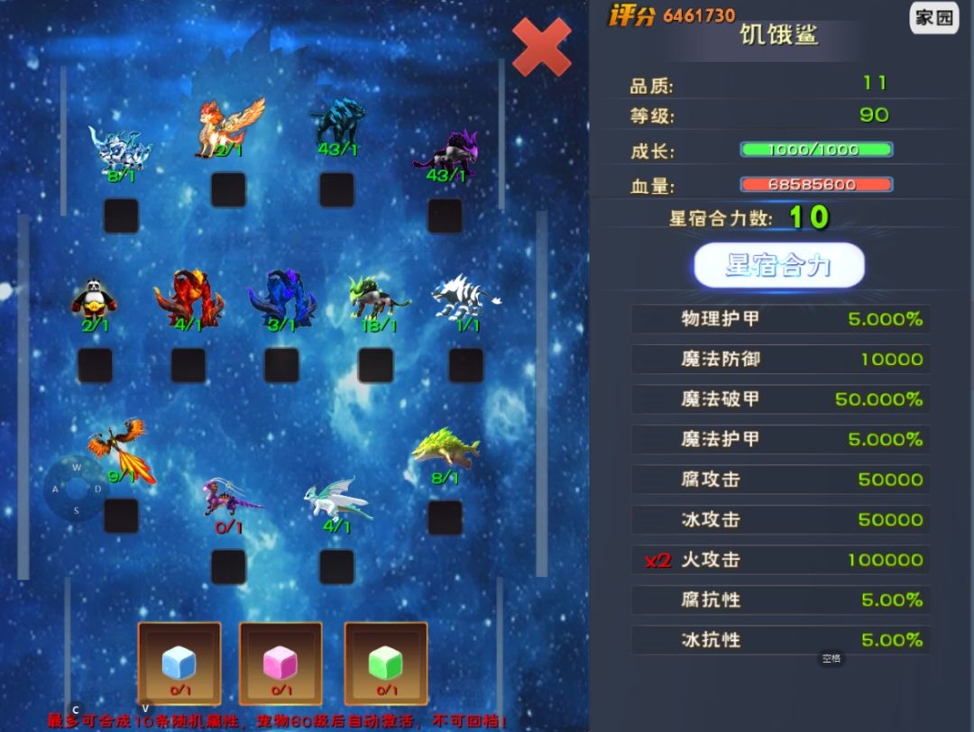 最多可一次勾选10个不同种类的宠物灵(选择几种不同种类的宠物灵对应洗出的词条个数)+3种宠物糖各一个开启星宿合力。(词条纯随机,最多可洗出10叠单属性)