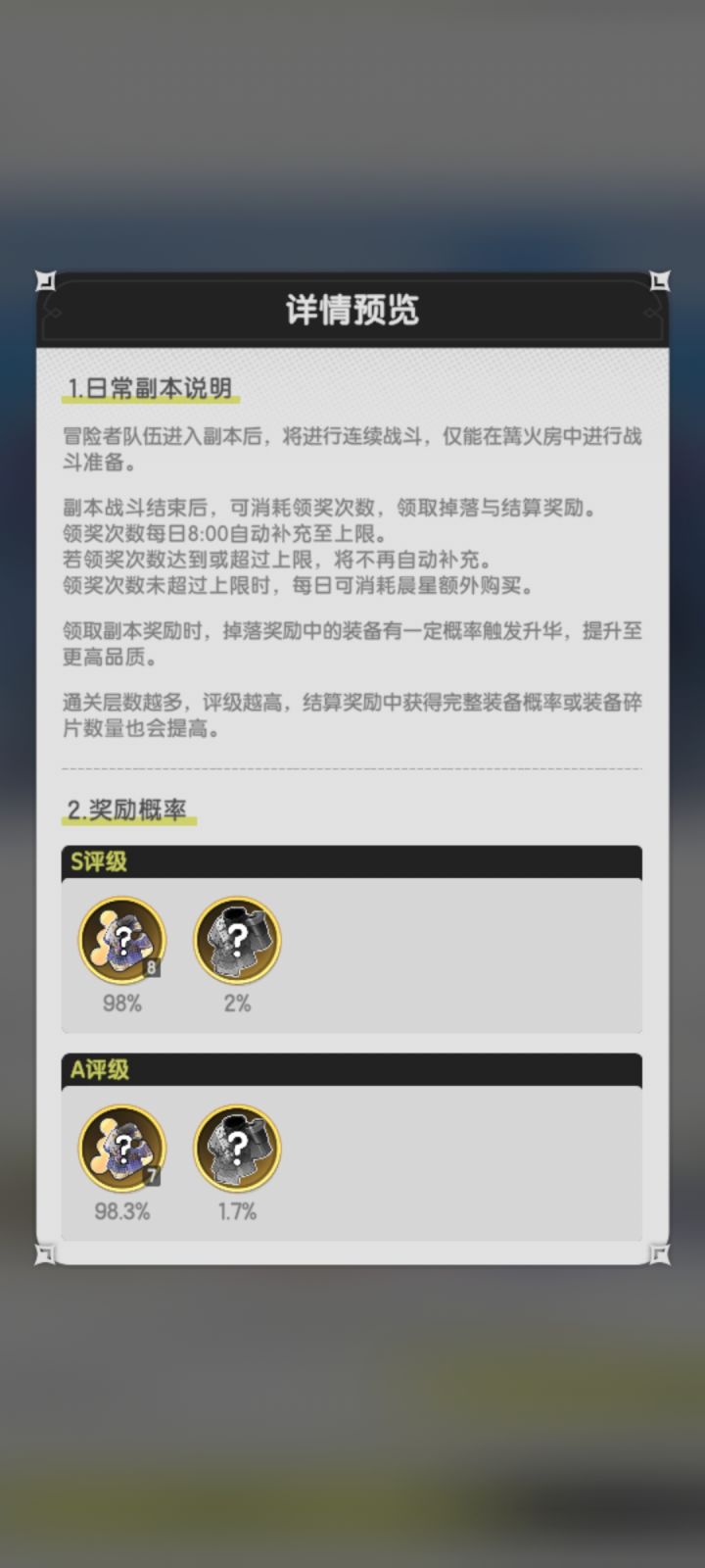 首先说一句,平民别想困难,困难起码是3转之后才够战力需求。然后其实A评和S评差别只有:A评7碎+1.7%奇迹装。S评8碎+2%奇迹装+保底一件橙。