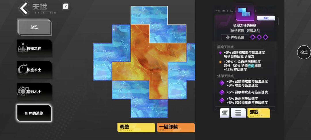 如果刷到了90级, 可以像下图这样, 买一个中间的大家伙"众星归所" , 它的作用是复制周围的所有紫色词条