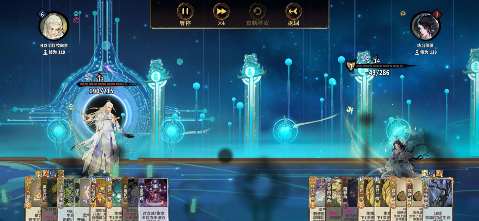 通过白蛇供给破绽最大化后续高伤害卡的输出,尽量做到一圈杀,但是由于全程走地到了元婴期会渐渐乏力