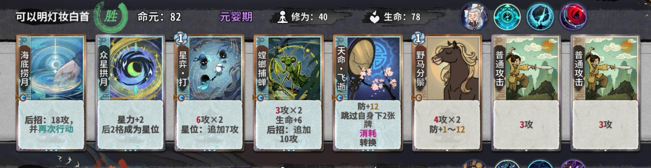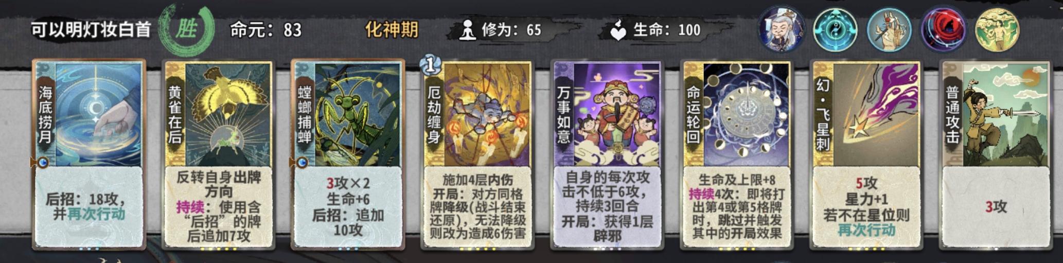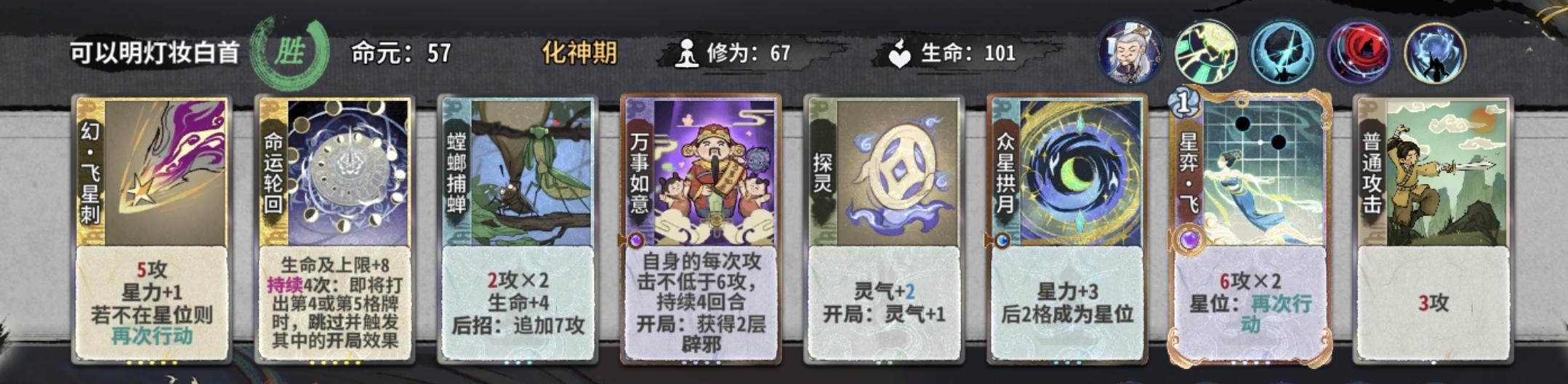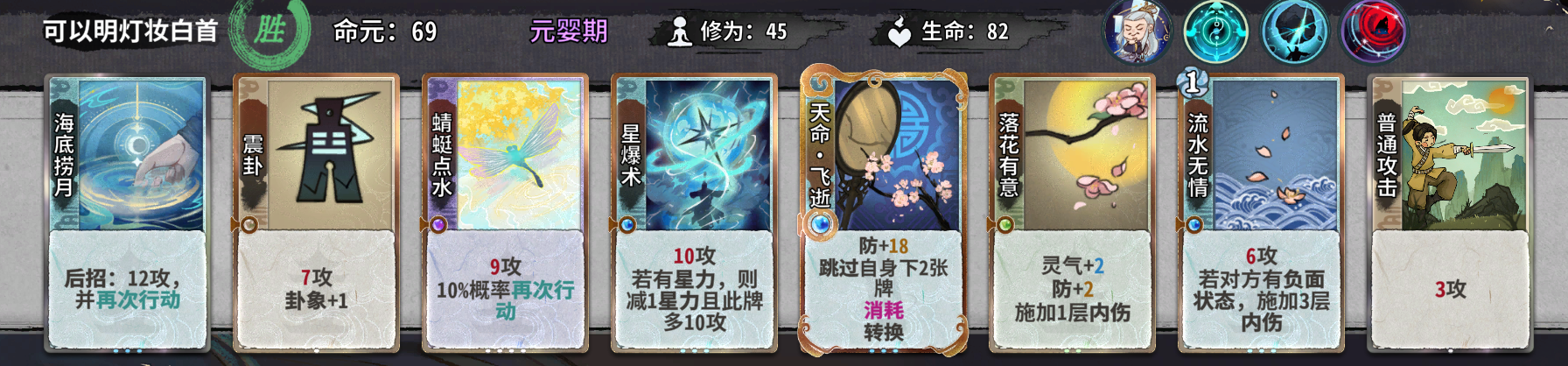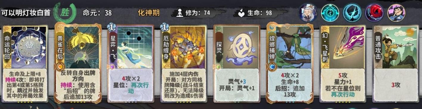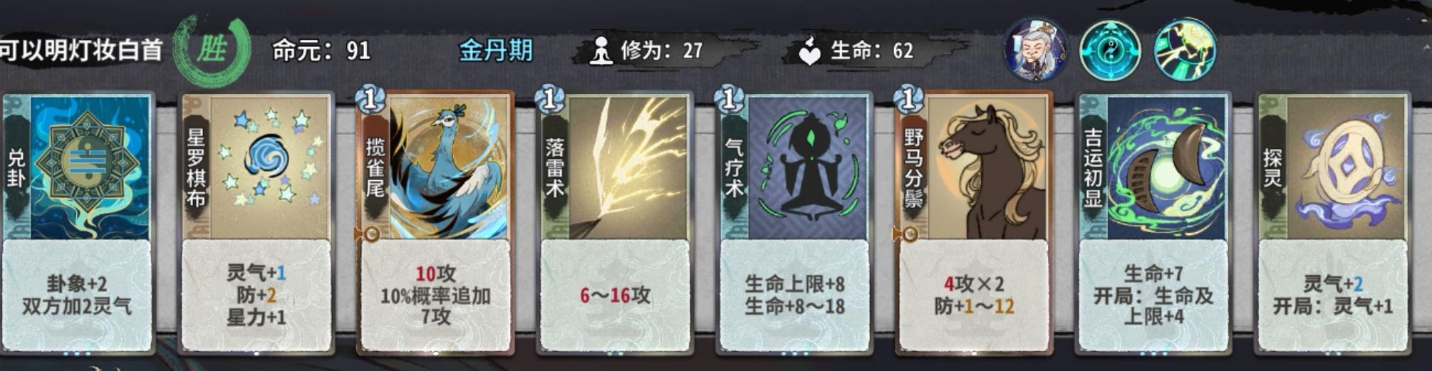 值得注意的是,如果筑基我们拿了顿悟,金丹就尽量不要再选择顿悟了,损失6d对我们金丹期找牌影响还是非常大的。