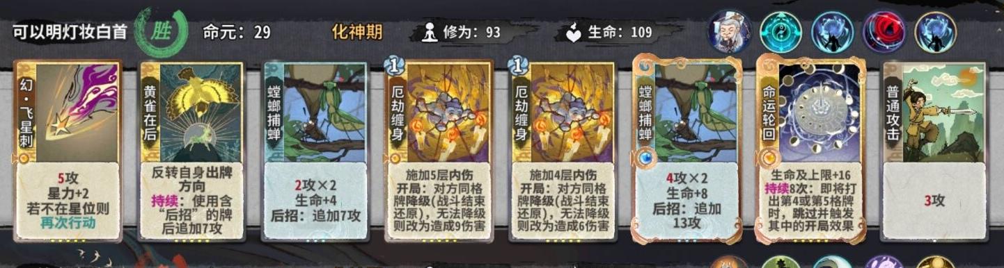 化神大d,优先d副职,因为我们可以没有黄雀,但是绝对不能没有轮子!当轮子迟迟不来时甚至厄劫也可以考虑d掉清理牌库。在成型公式中,一般黄雀和飞的等级没有那么重要,我们可以考虑将多余的飞、黄雀卖掉抢先手,或者d掉压缩牌库找高等级的飞星刺。