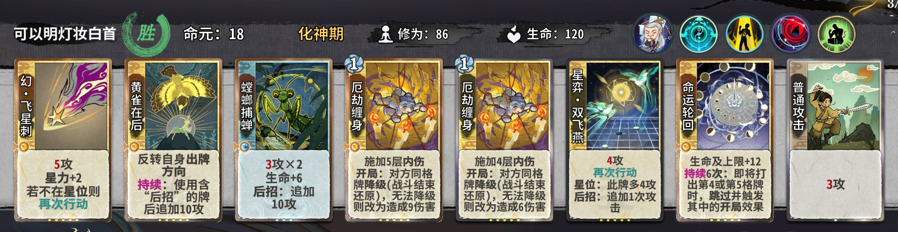 如果没有海底,一号位/四号位可以用消耗牌代替,八号位在金丹期同样可以塞血光、吉运等命理牌