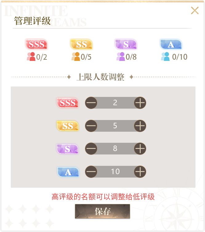 每个协会初始名额为:2名SSS级、5名SS级、8名S级、10名A级、B级不限,评级后在协会成员没有变动情况下,允许档位人数超过上限。但成员退出后无法重新加入名额上限档位;若高评级档位人数未满,协会会长/副会长可以调整未被占用的高评级名额至低评级名额。