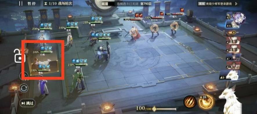 *多了白狐的上阵,可让曹仁的【八门金锁】突破6人的限制,集中保护中心的同时兼顾对所有人的保护。