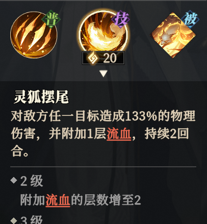 普攻和绝技造成伤害并附加【流血】,被动降低白狐消耗和挂【流血】频率。