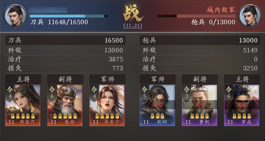 军令并非越高越好,樊梨花只有4令,但额外兵力的技能非常有用,廉颇站撸能加属性、勾践、秦琼和典韦都有减伤。游戏的队伍是兵力共享的,所以不存在主将阵亡就战败,主副将的位置没特别区分,后期怒气技将领需要放在主将。