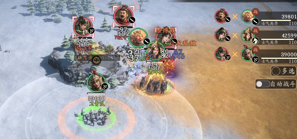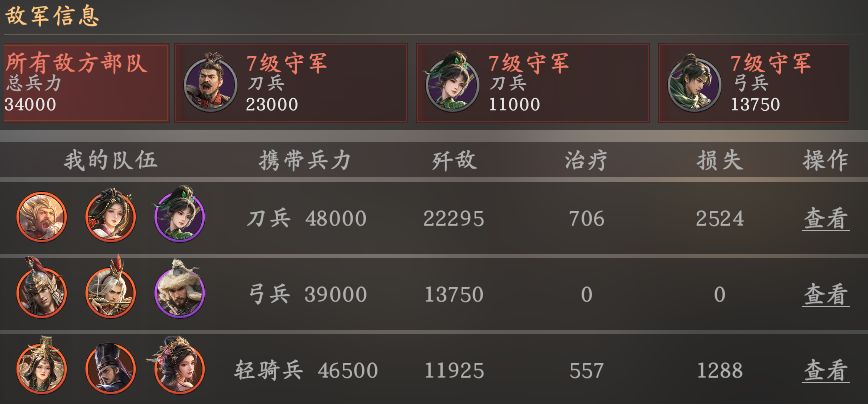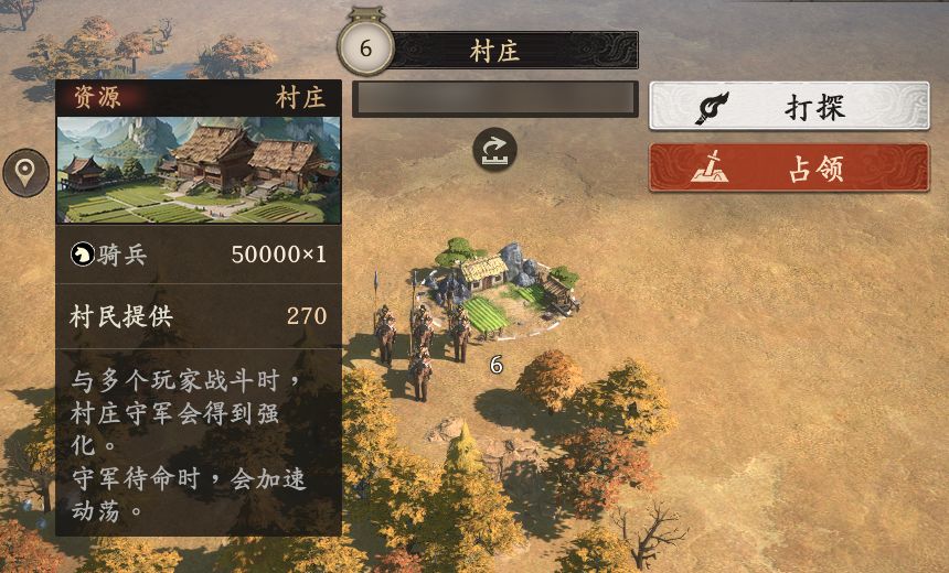 野地是有随机组合的,每次用寻找都会刷新一些不一样的守军配置,可以点击打探直接查看兵种和技能。例如单一守军,但是兵力多的;也有多守军但单一兵力低的。一般后者更容易打一些,可以在打探后挑选主力是刀盾兵的村庄,利用克制打掉守军脆皮减少输出,最后一队刀兵承伤,一队枪骑输出。