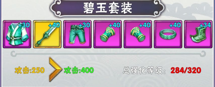 前面强化全用来强化1级装备,全部强化到20级就可以激活250攻击