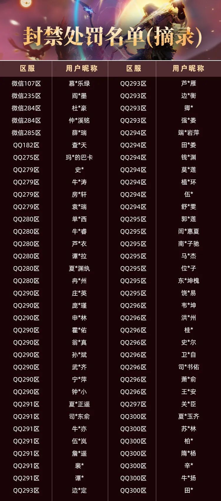 经统计,山海五月累计封号处罚账号35466个,其中136个账号已被采取全区封禁十年的顶格处罚,以下为五月经官方核实后给予封禁十年处罚的账号信息(部分摘录):
