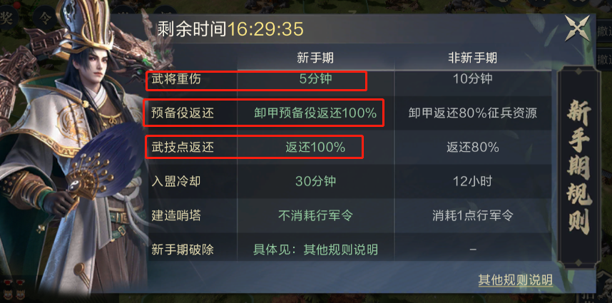 在新手期内搭配阵容开荒土地增加势力值,新手期内体力每次消耗只有八点,占领后冷却时间为1分30秒,武将重伤为五分钟,武将配上去的兵力卸甲以及武技点会100%返还,前两天快速消耗武将体力发育自己势力值。