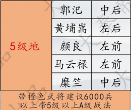 五级稍微难度大一点,武将等级二十级以上,六千多兵力,技能升到六七级