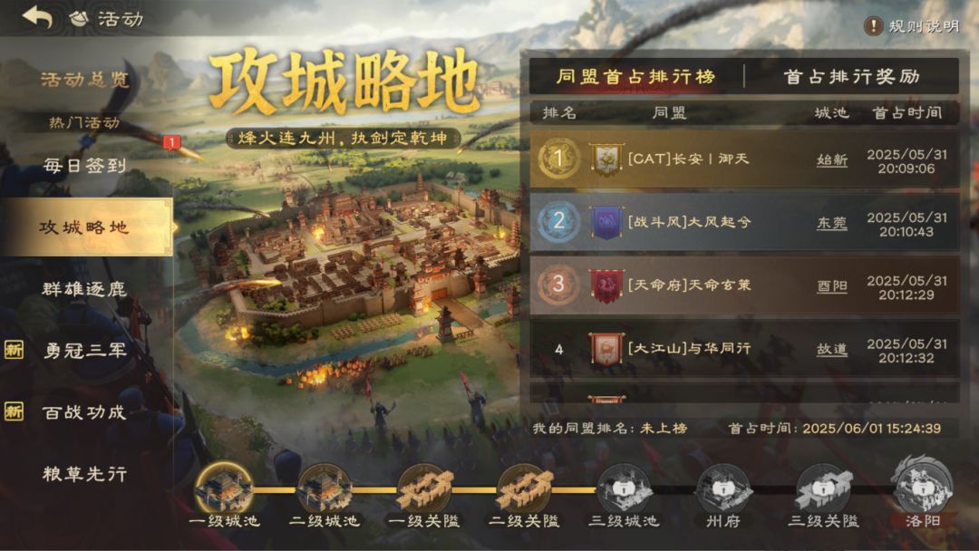 在“攻城略地”活动中,【CAT】已是三度夺得第一宝座,这回他们在当涂关前集结,同为【长安】的【CAE】则落堡石阳关前,不知他们是否能继续夺下二级关隘的首占第一。