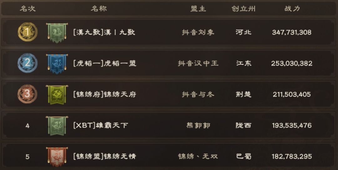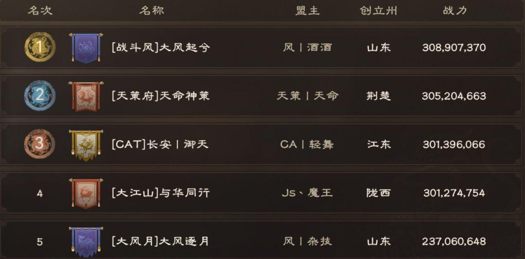 1区同盟战力排行榜如下,【战斗风】以3亿890万战力暂居榜首,后面的【天策府】、【CAT】和【大江山】战力紧咬。熟悉1区的主公都知道,战力排行并非唯一标准。