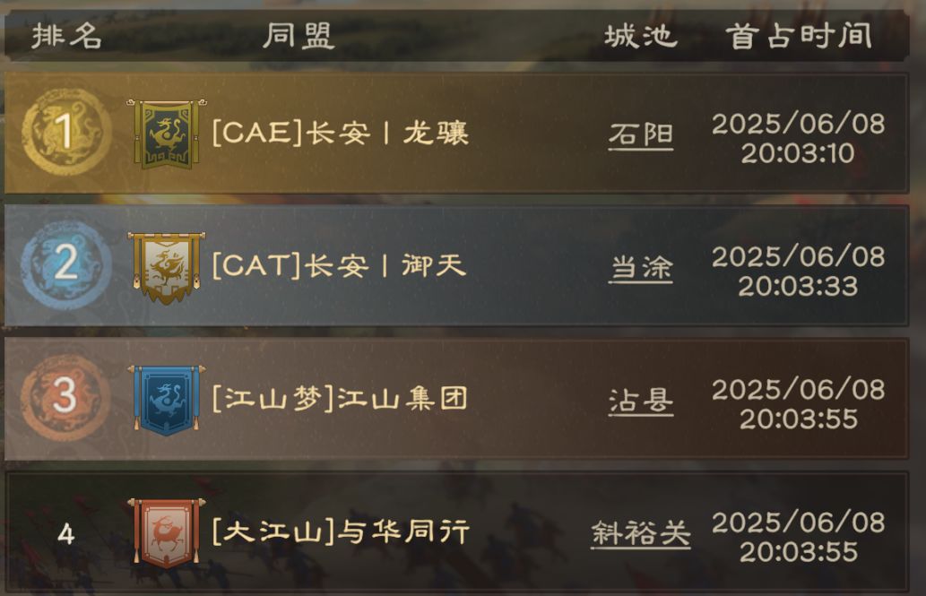 第二个进入资源州的则是老熟人【CAT】,随后分盟众多的【江山】也开始出现在排行榜上,【江山梦】和【大江山】均用时3分55秒拿下二级关隘,夺关时间都如此统一,可见联盟成员之团结。