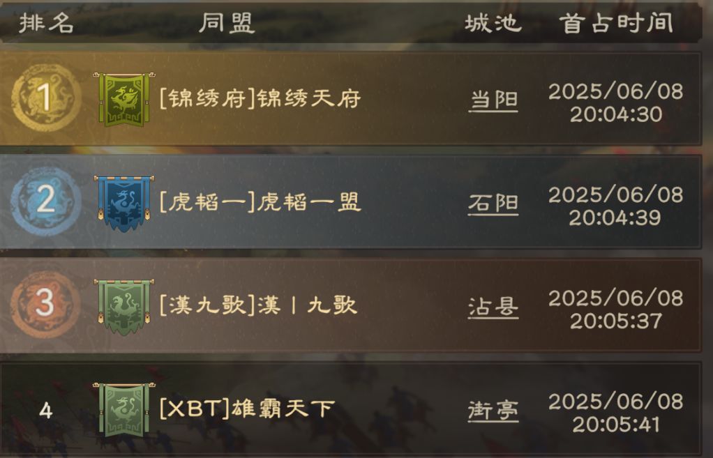 来到2区,第一个夺下二级关隘的不是高战同盟【漢九歌】与【虎韬一】,而是排行第三的【锦绣府】,用时4:30拿下当阳;前两者分列第二与第三。