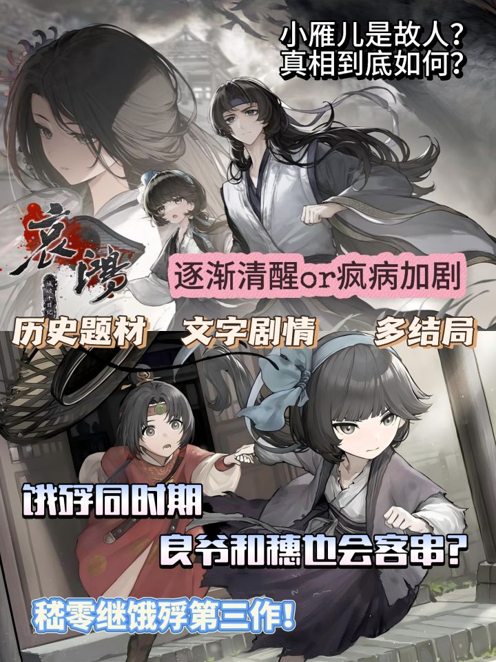 📚剧情介绍:故事和【饿殍·明末千里行】同属一条时间线:明末崇祯十五年,故事主人公的你将作为一名书生【方知宥】,因青梅竹马、扬州城头牌伶【苏怜烟】跳河自尽,受刺激疯了三年 。三年后的醉酒夜,竟穿越到自己写的小说《狮驼国》里,而狮驼国正上演着妖兵入城、烧杀抢掠的惨象,你将在这里偶遇一个小女孩小雁儿,而这小燕儿竟与苏怜烟长相相似、名讳一致,这让你有了活下去的念头。
