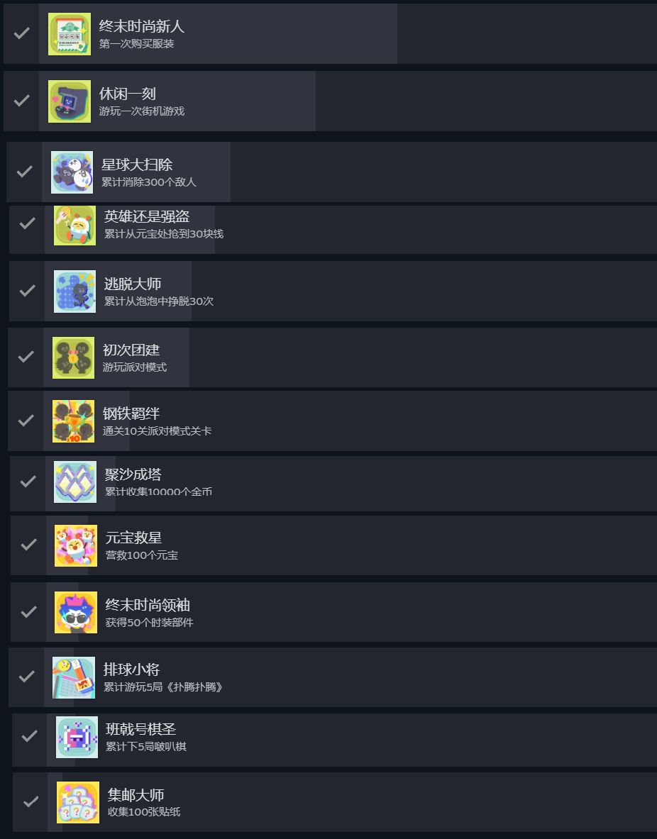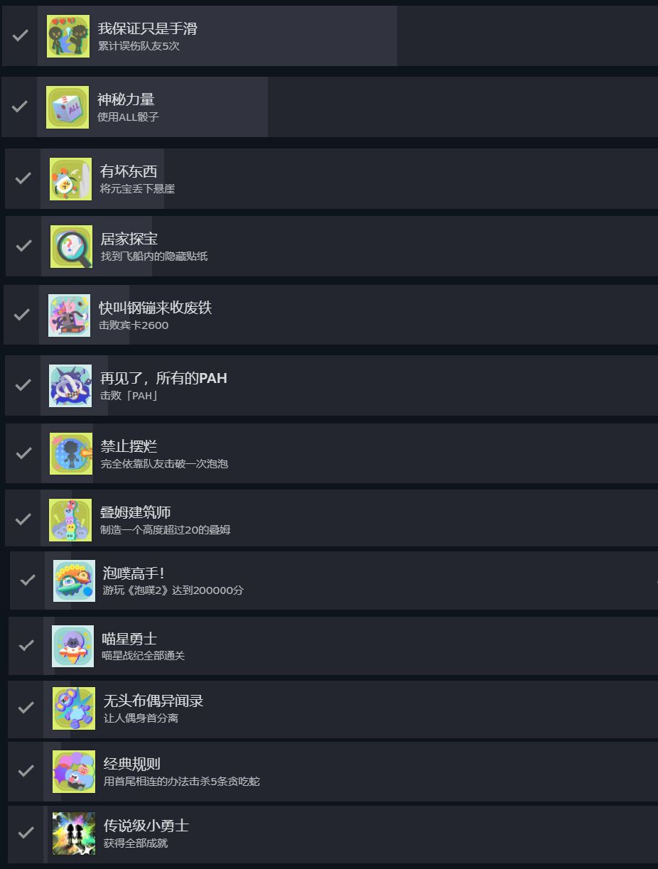 派对模式,3人可开,一共16关,完成10关会弹成就,完整通关视频如下:
