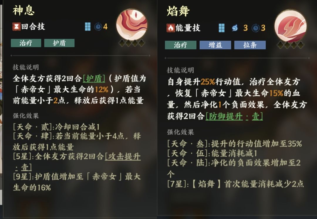 一个字,强。回合技是2级攻击,能跟1级攻击叠加,加起来就是85%的攻击提升。大招加盾机制领先,打洪荒必备。3星起用,5星够用。开服不改必抽。
