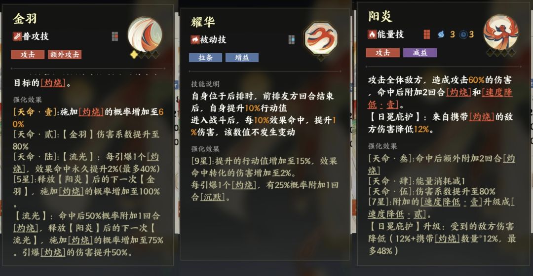 加强,虽然失去了减耗,但挂灼烧概率得到加强,被动还增加了沉默,大招还有减伤。唯一的小问题是刚需大招但大招加点不减冷却。拉条沉默减伤,兼顾pve和pvp。索敌机制不改的情况下,打boss上限后羿高,爬塔手感金乌好