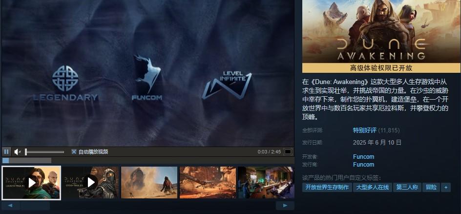 由Funcom开发的生存建造类MMO新作《沙丘:觉醒》近日在Steam平台评价出现逆转,从多半差评转为特别好评。
