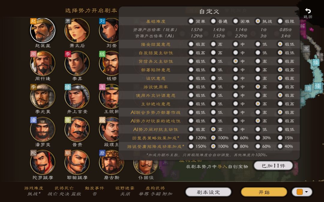 ps:本来是打算做困难和极限两个难度的,但是这个本子里势力实在太多了,人物分配很容易弄混,全部放置、设定完毕就用了将近两个小时,还望诸位理解。