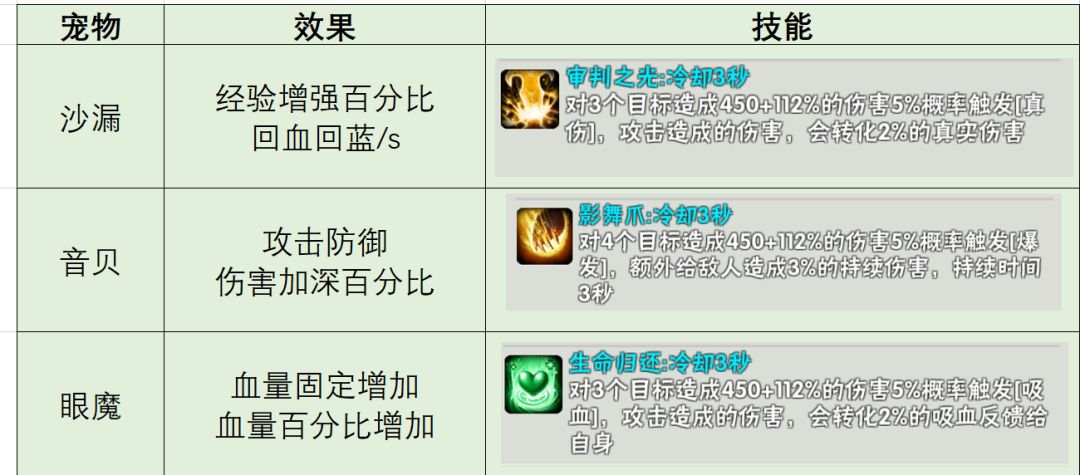 目前主流的宠物分为“音贝”眼魔“”“沙漏”,这三个每个阶段都有很大的不同,但是目前游戏宠物升级还不能重置,所以一开始的选择很重要,三个都养资源是不够的,只能把升级材料集中一个宠物,这样带来的被动加成才更可观
