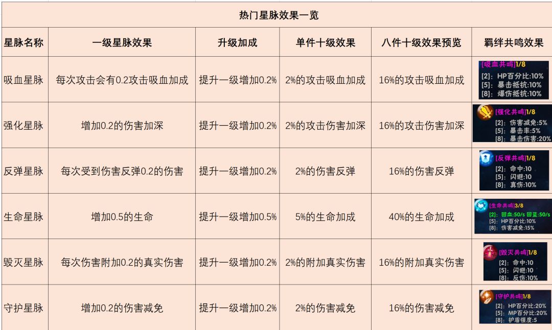 星脉八件装备洗练同一种星脉难度较大,游戏中很多玩家也会搭配,比如5强化3吸血,这样搭配会激活2个羁绊一个是吸血羁绊10%生命加成,另外就是5强的2个羁绊伤害减免5%和暴击率5%