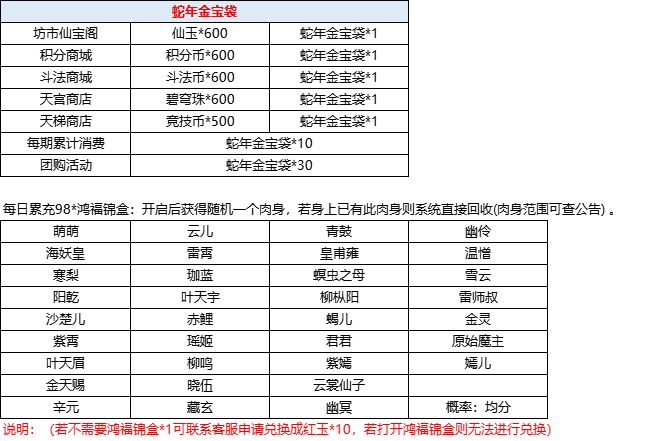 ②、2000充值豪礼:活动期间内如不需要《仙魔灵宝*100》、灰太狼、哮天犬、米粒龙、花花、玉兔、上古丹书、太阴鬼典、五雷天书、万毒混元、五藏锻元功、九转还魂诀、帝魂诀、天仙大丹诀、斩邪宝篆、饕餮魔经、飞升诀、化神诀、万藏剑典、玉清密录、长生道经、镇天浮屠、八九玄功、开天雷经、紫霄神诀、九幽冥法、无极神功、赵千颖、彭越、钱慧娘、风铃、血锋、水嫣林、冰凤、皇甫玉魄、金宇、金蛮老祖、海族圣女、八孔双异能胚子其中1个。