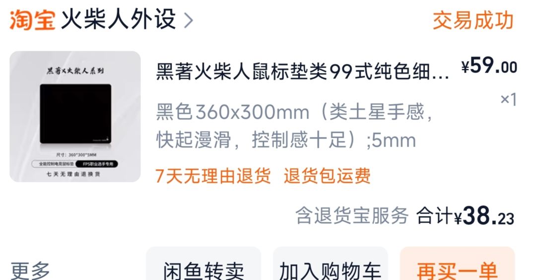最后介绍的是我的鼠标垫,之前一直用的二游的官方鼠标垫,但发现打fps真有点力不从心,手感不太好。于是我就抱着试试看的态度买了张便宜的游戏鼠标垫,就是这款火柴人的类土星鼠标垫,手感中性偏涩,表面织线排列分明,快起慢滑,手感很好。