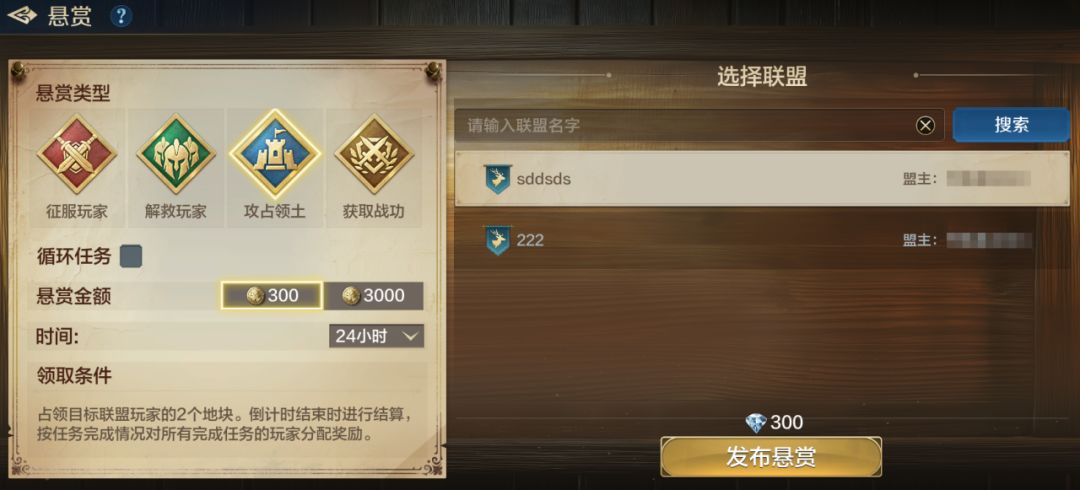 任意玩家皆可以在满足条件的联盟中发布悬赏任务,或者完成悬赏任务领取赏金。