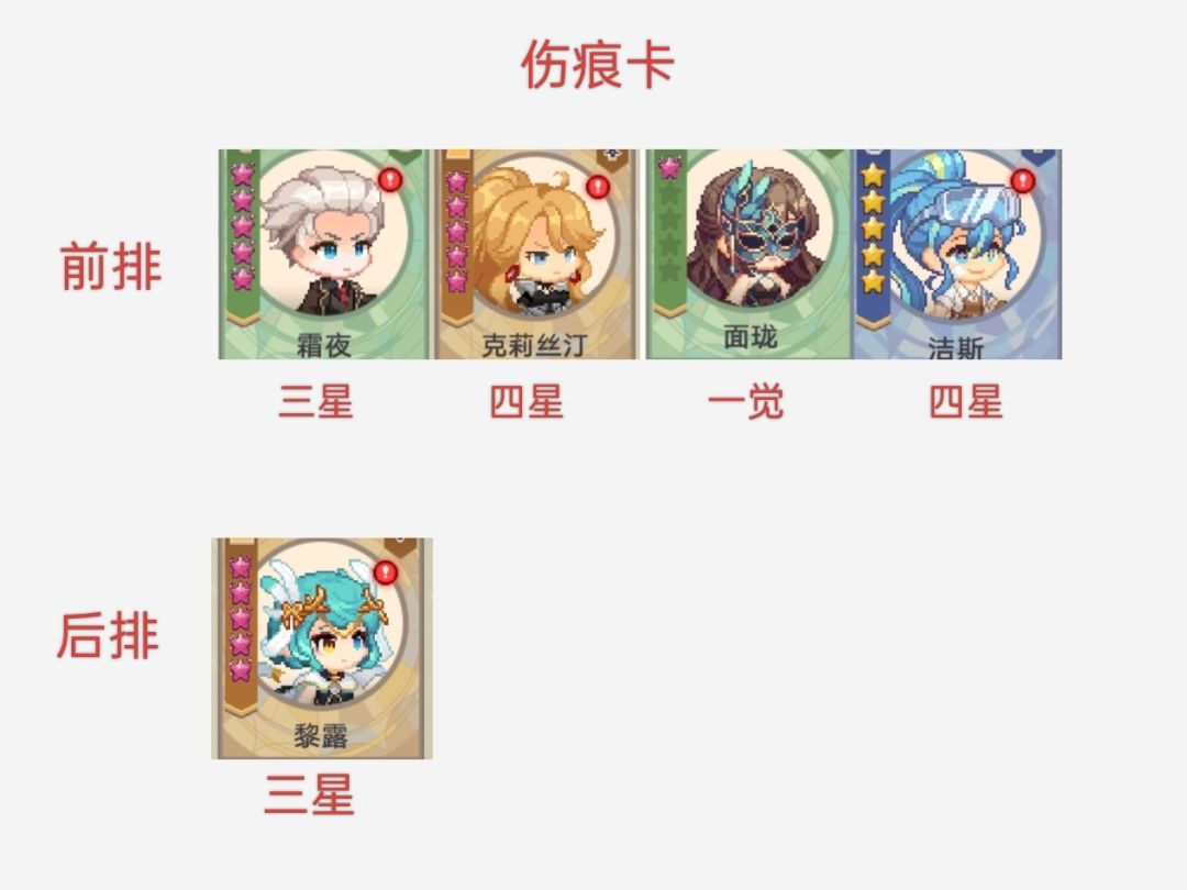 打boss时如主c技能为多段时应尽可能多上伤痕角,(单段没有意义,太多也无法消耗造成伤痕溢出)括号内为拥有伤痕的星数,前排伤痕较多,打常规boss可以上到3伤痕角,所以后排c更优.