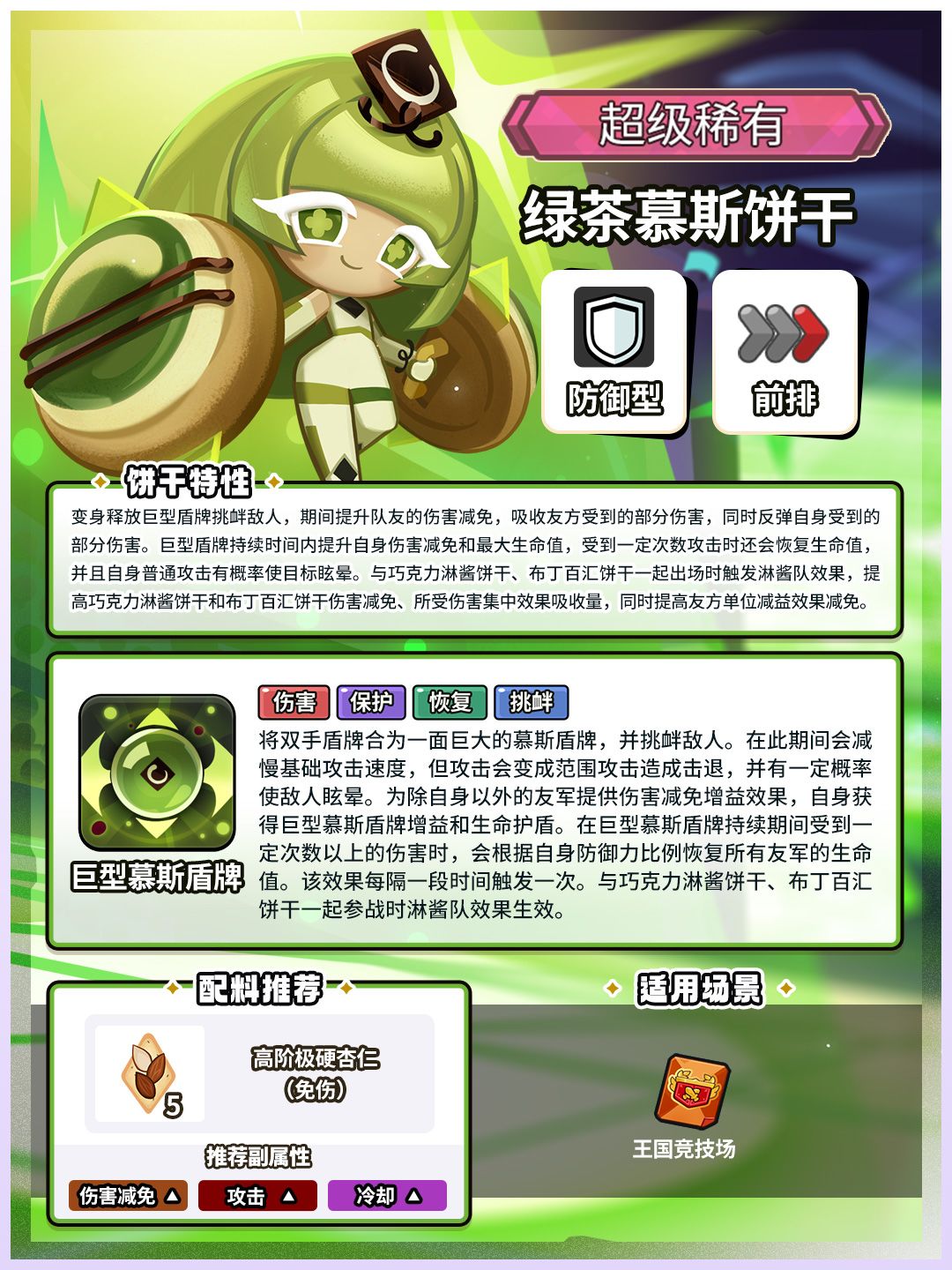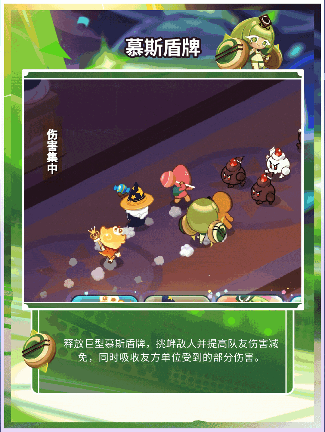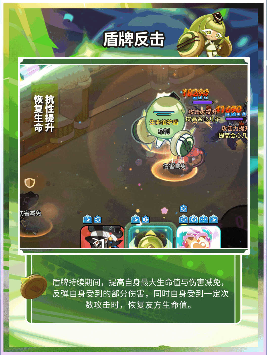 变身释放巨型盾牌挑衅敌人,期间提升队友的伤害减免,吸收友方受到的部分伤害,同时反弹自身受到的部分伤害。巨型盾牌持续时间内提升自身伤害减免和最大生命值,受到一定次数攻击时还会恢复生命值,并且自身普通攻击有概率使目标眩晕。与巧克力淋酱饼干、布丁百汇饼干一起参战时淋酱队效果生效。